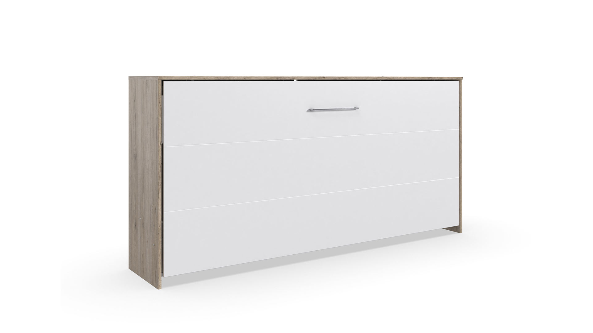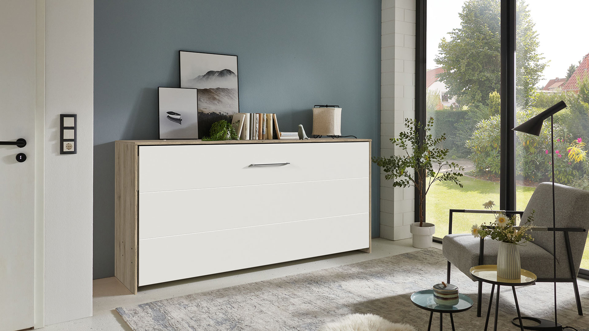 Geschlossen bleibt JUIST angenehm zurückhaltend. Mit nur 43 cm Tiefe macht es sich schön schlank. Horizontal wirkt es wie ein Sideboard, vertikal wie ein kleiner Schrank. Offen zeigt sich dann, was in ihm steckt: ein gemütlicher Schlafplatz – ultrabequem und bereit, wenn der Tag Pause macht.