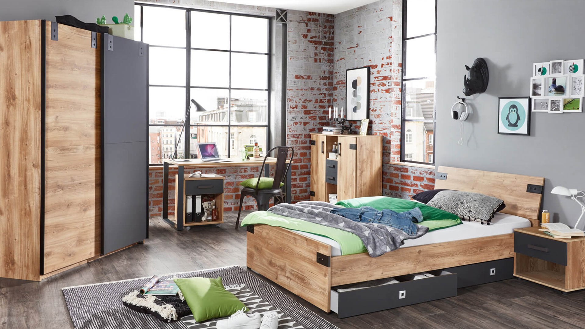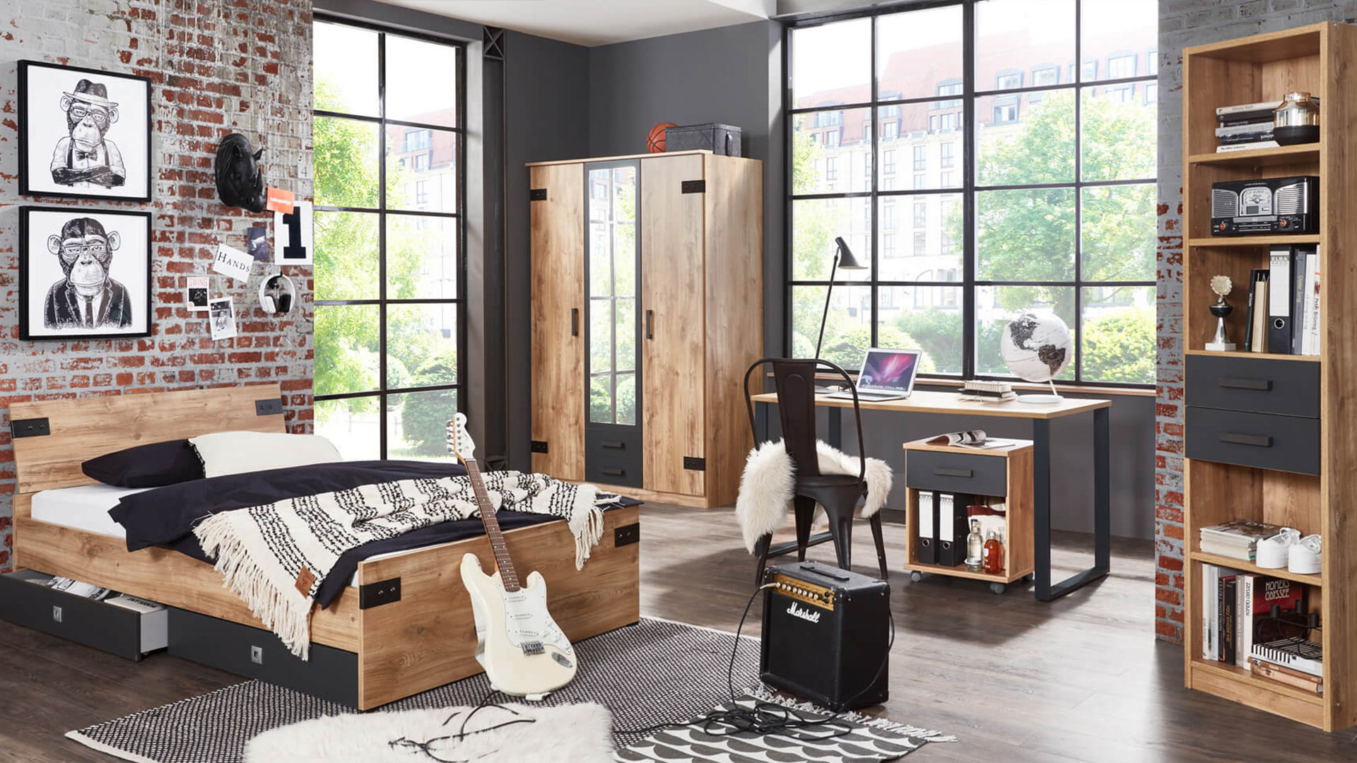 LIVERPOOL ist nicht nur als die musikalische Heimat der Beatles bekannt, sondern auch Namensgeber für dein zukünftiges Jugendzimmer im angesagten Industrial-Look. Geschaffen zum Chillen, Jammen, Abhängen und Musik hören wird es dir in diesem Zimmer dank des coolen Loft-Feelings garantiert nicht langweilig. Gefertigt aus robuster Plankeneiche-Nachbildung und mit zahlreichen Absetzungen in Graphit versehen, geben Highlights wie robuste Eisenbeschläge an Schrank und Bett, massive Eisenfüße am Schreibtisch sowie zweifarbige Bettkästen, flexible Rollcontainer und Kleiderschränke mit extra viel Stauraum im Jugendzimmer LIVERPOOL den Ton an.