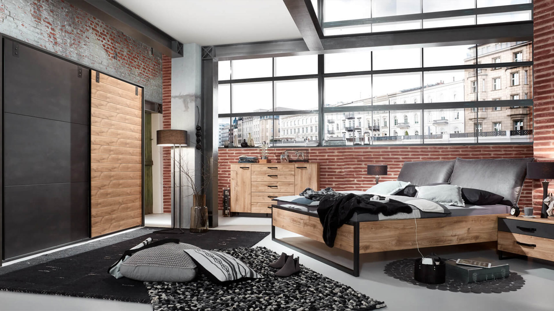 Heavy Metal! Mit dem Schlafraumprogramm DETROIT rockst du dein Zuhause und findest dich beim Aufwachen in einem Loft mit Industrial-Charme wieder. Fühl dich der Großstadtmetropole ganz nah und entdecke das einzigartige Design der robusten Schlafzimmermöbel mit dem modernen Touch. Dank der praktischen Drehtüren- und Schwebetürenschränke inklusive diverser Spiegel, Schubladen, Einlegeböden und Kleiderstangen schaffst du in deinem individuell eingerichteten Apartment ausreichend Stauraum, während du in den großzügigen Schubkasten- und Kombikommoden der Serie DETROIT alles verstaust, was du bei deinen täglichen Streifzügen durch den wilden Großstadtdschungel benötigst.