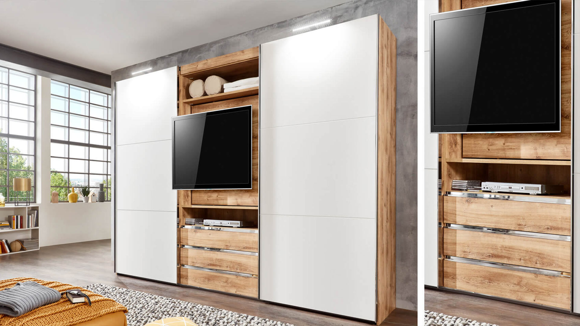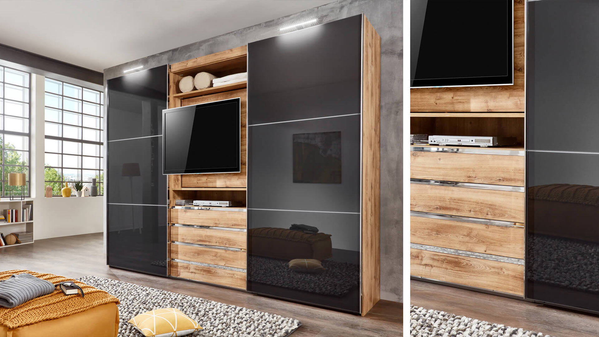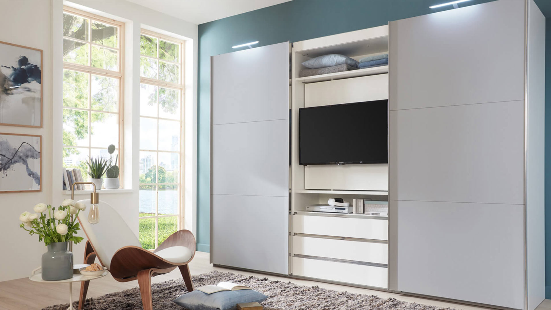 Die Besonderheit zeigt sich bei einem Blick ins Innere; geben die zur Seite geschobenen Schwebetüren doch ein gut gehütetes Geheimnis preis: Neben seiner Funktion als Kleiderschrank mit extra tiefen Einlegeböden, stabilen Kleiderstangen und extrem geräumigen Schubladen beherbergen die Schwebetüren ein mittig offenes Fach, in dem sich auf wundersame Weise genügend Platz für einen frei montierbaren Flatscreen befindet. Statt TV wahlweise auch mit einem drehbaren Spiegelelement zu versehen, präsentiert sich der Schwebetürenschrank MAGIC je nach deiner persönlichen Vorliebe mal als Stauraumwunder mit Entertainment-Faktor oder als Ordnungshelfer mit Fashion-Faible.
