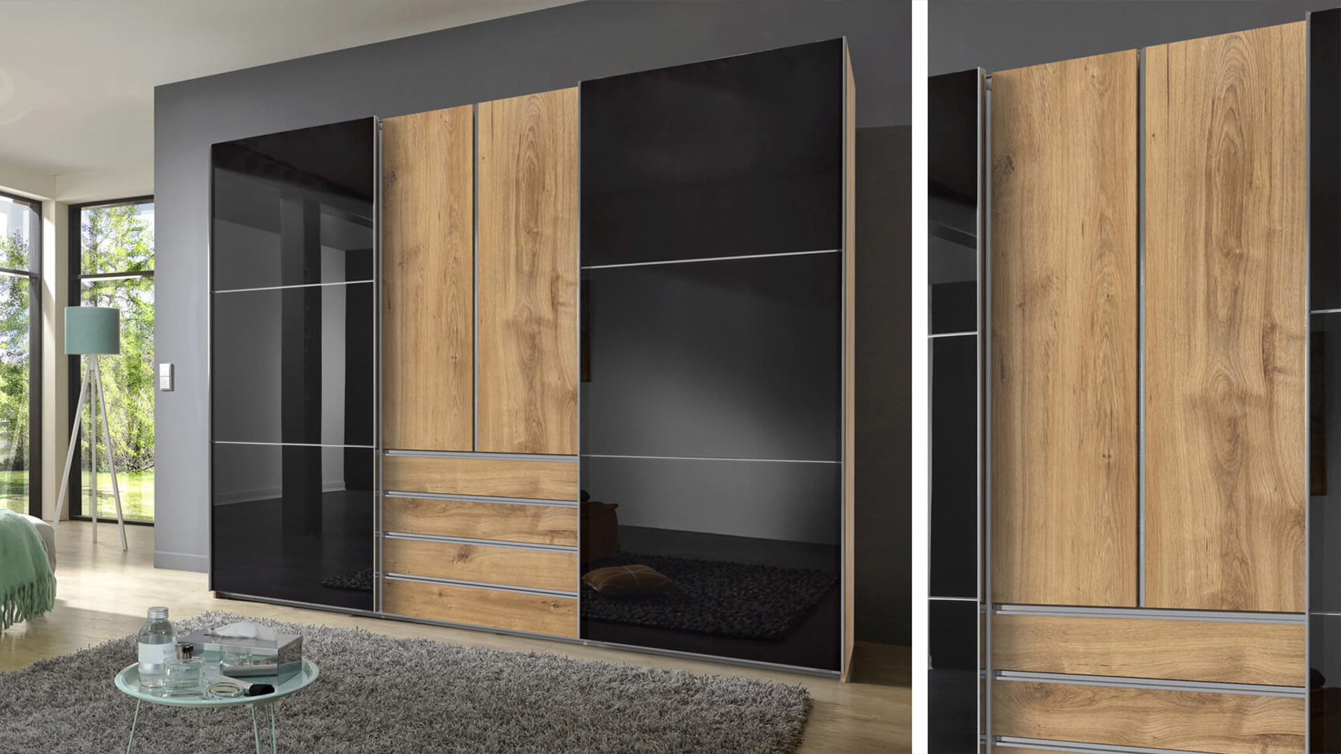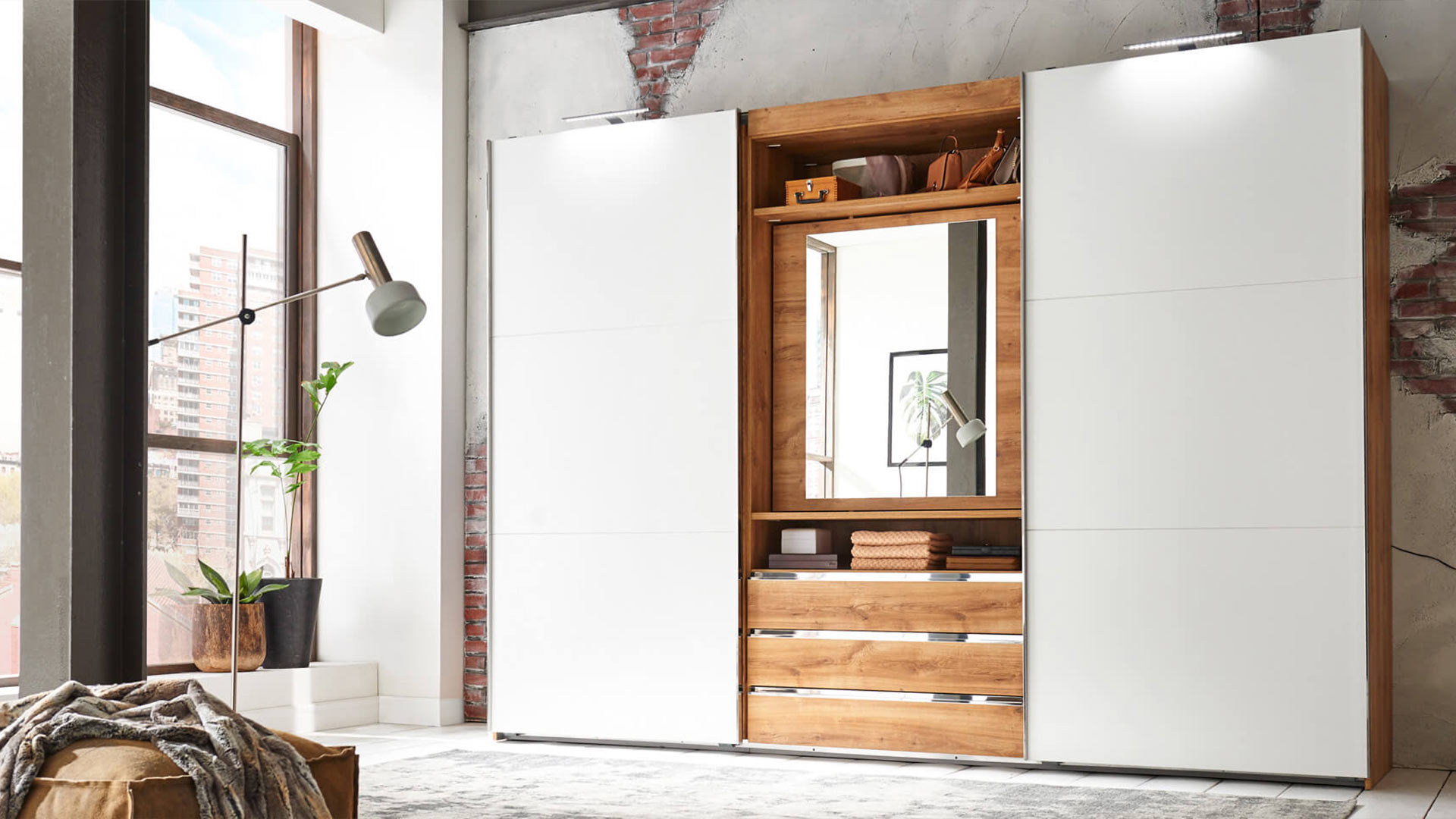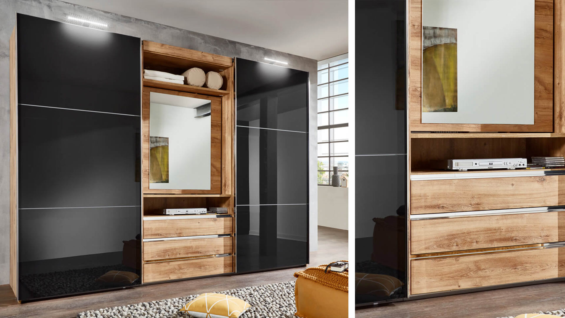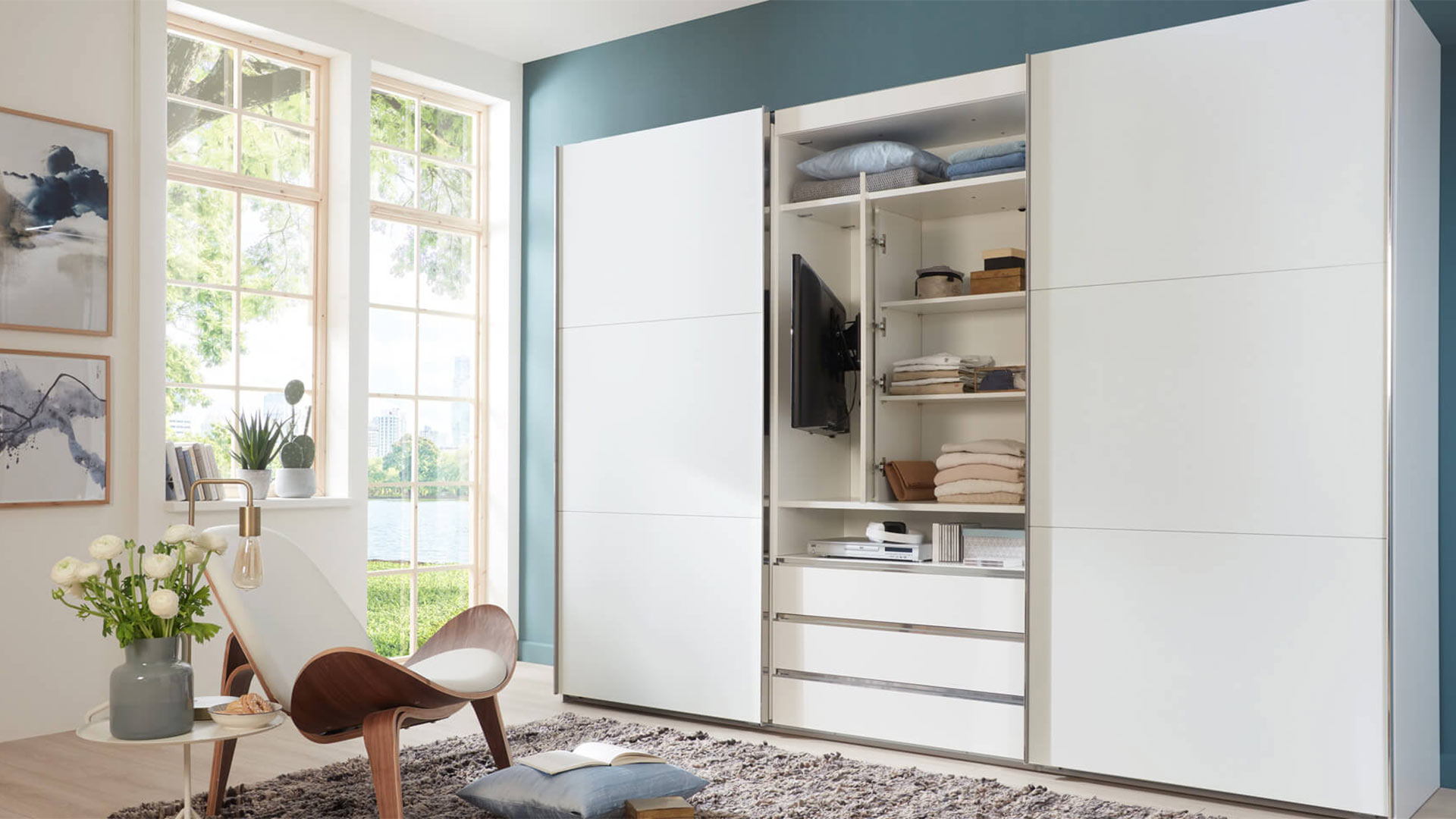 Die Besonderheit zeigt sich bei einem Blick ins Innere; geben die zur Seite geschobenen Schwebetüren doch ein gut gehütetes Geheimnis preis: Neben seiner Funktion als Kleiderschrank mit extra tiefen Einlegeböden, stabilen Kleiderstangen und extrem geräumigen Schubladen beherbergen die Schwebetüren ein mittig offenes Fach, in dem sich auf wundersame Weise genügend Platz für einen frei montierbaren Flatscreen befindet. Statt TV wahlweise auch mit einem drehbaren Spiegelelement zu versehen, präsentiert sich der Schwebetürenschrank MAGIC je nach deiner persönlichen Vorliebe mal als Stauraumwunder mit Entertainment-Faktor oder als Ordnungshelfer mit Fashion-Faible.