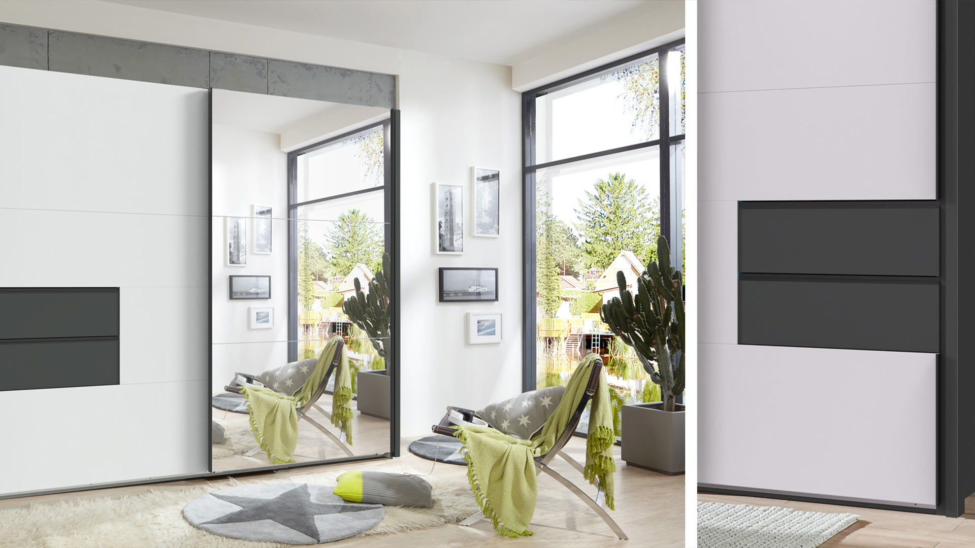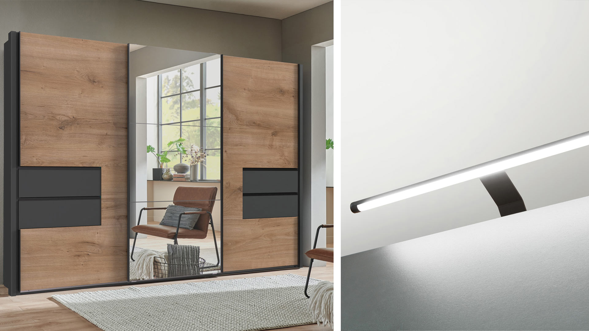 Wähle deinen Schrank in modernem Graphit mit eleganter weißer Front oder entscheide dich für die warme Ausstrahlung der Front in Plankeneiche-Nachbildung – ganz nach deinem persönlichen Stil. Die zeitlosen Designs fügen sich nahtlos in jedes moderne Schlafzimmer ein und verleihen deinem Raum das gewisse Etwas. Und mit den stilvollen Passepartoutleisten verpasst du deinem Schrank den letzten Schliff. Sie rahmen den Schrank ein wie ein kunstvolles Gemälde und lassen ihn noch majestätischer wirken.