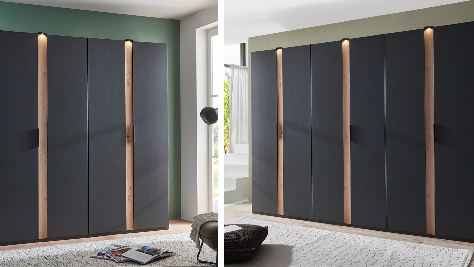 In zwei aufregenden Farboptionen erhältlich, macht RIMINI dein Zuhause einzigartig. Pures Weiß mit Graphit-Akzenten gibt deinem Raum moderne Eleganz und cooles Graphit mit Details in Artisaneiche-Nachbildung schafft einen starken, markanten Look. Mit drei verschiedenen Breiten zur Auswahl passt sich RIMINI perfekt deinem Platzangebot an und seine schicken Drehtüren verbergen großzügigen Stauraum für deine Garderobe – von der edlen Abendrobe bis zum legeren Alltagslook.