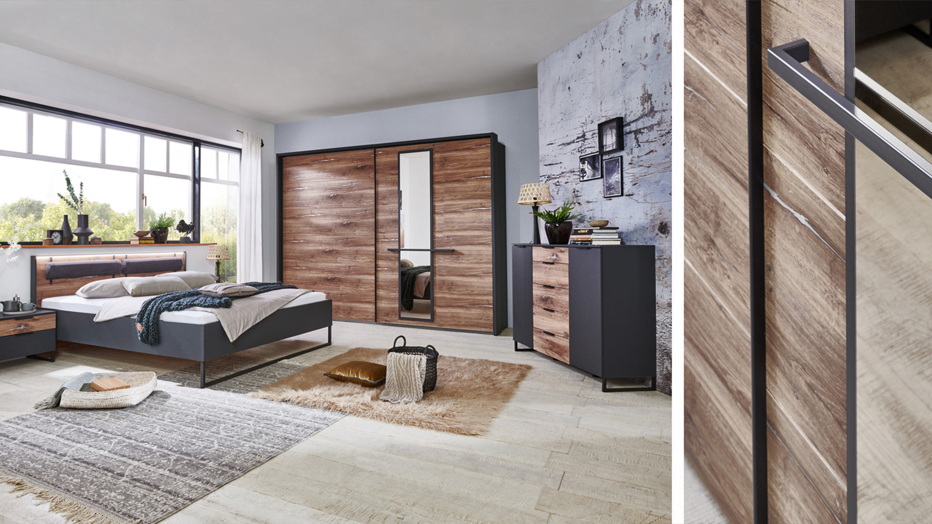 Hol dir dein Schlafzimmer mit Vintage-Charme. Wie die Stadt im kanadischen Manitoba überrascht auch das Schlafraumprogramm WINNIPEG mit seinen reizvollen Gegensätzen. Geprägt von der rustikalen Altholz-Optik mit lebendigen Rissen und Astlöchern, die durch einen überraschenden Silber-Metallic-Effekt markant hervorgehoben werden, bekommst du moderne Apartment-Möbel im coolen Industrie-Look.