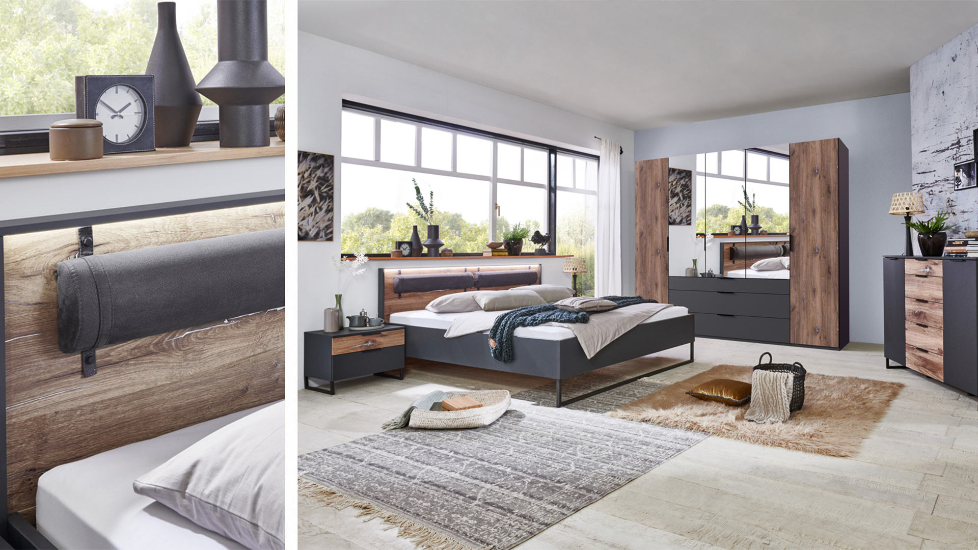 Die spannende Kombination mit dunklem Graphit versetzt dich im Handumdrehen in die pulsierende Stimmung des angesagten historischen Stadtkerns von „The Peg“ mit seinen Läden, Bars und Festivals. Auch in Sachen Ausstattung und Komfort kannst du mit WINNIPEG nur gewinnen. Praktische Drehtürenschränke mit Schubkästen – die oberste jeweils als niederige Accessoire-Schublade – und platzsparende Schwebetürenschränke bieten dir ausreichend Stauraum für die verschiedenen Outfits, die du für deinen quirligen Tag brauchst. Und nach deinen ereignisreichen Touren erholst du dich im komfortablen Futonbett mit bequemen Kunstleder-Polstern am Kopfteil. Das höhenverstellbare Bett steht – wie auch die geräumigen Kommoden und Nachtschränke der WINNIPEG-Serie, in denen du weitere Teile deiner täglichen Ausstattung unterbringen kannst – auf metallenen Kufen: mattschwarz unterstreichen sie souverän den trendigen Retro-Look.