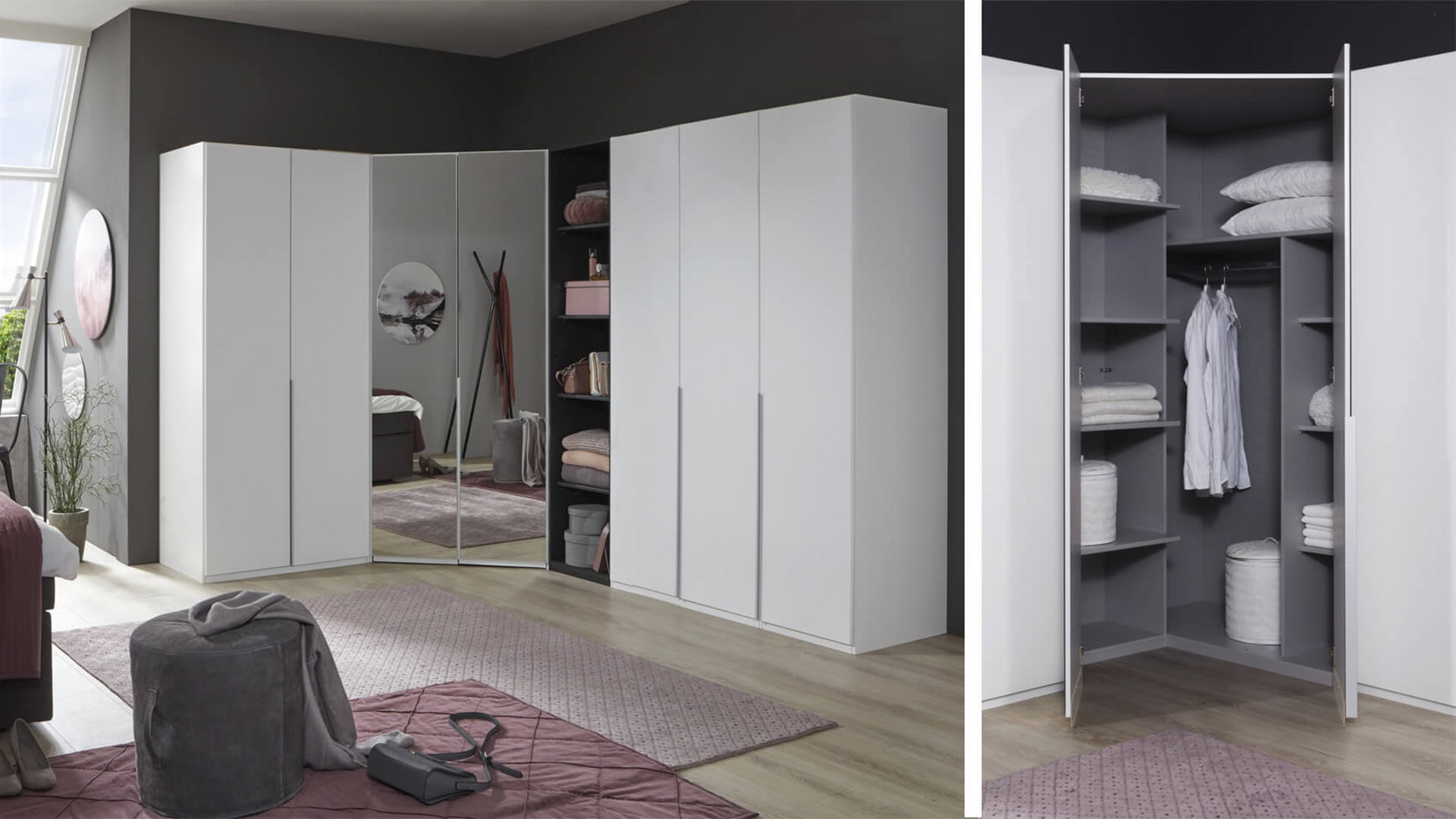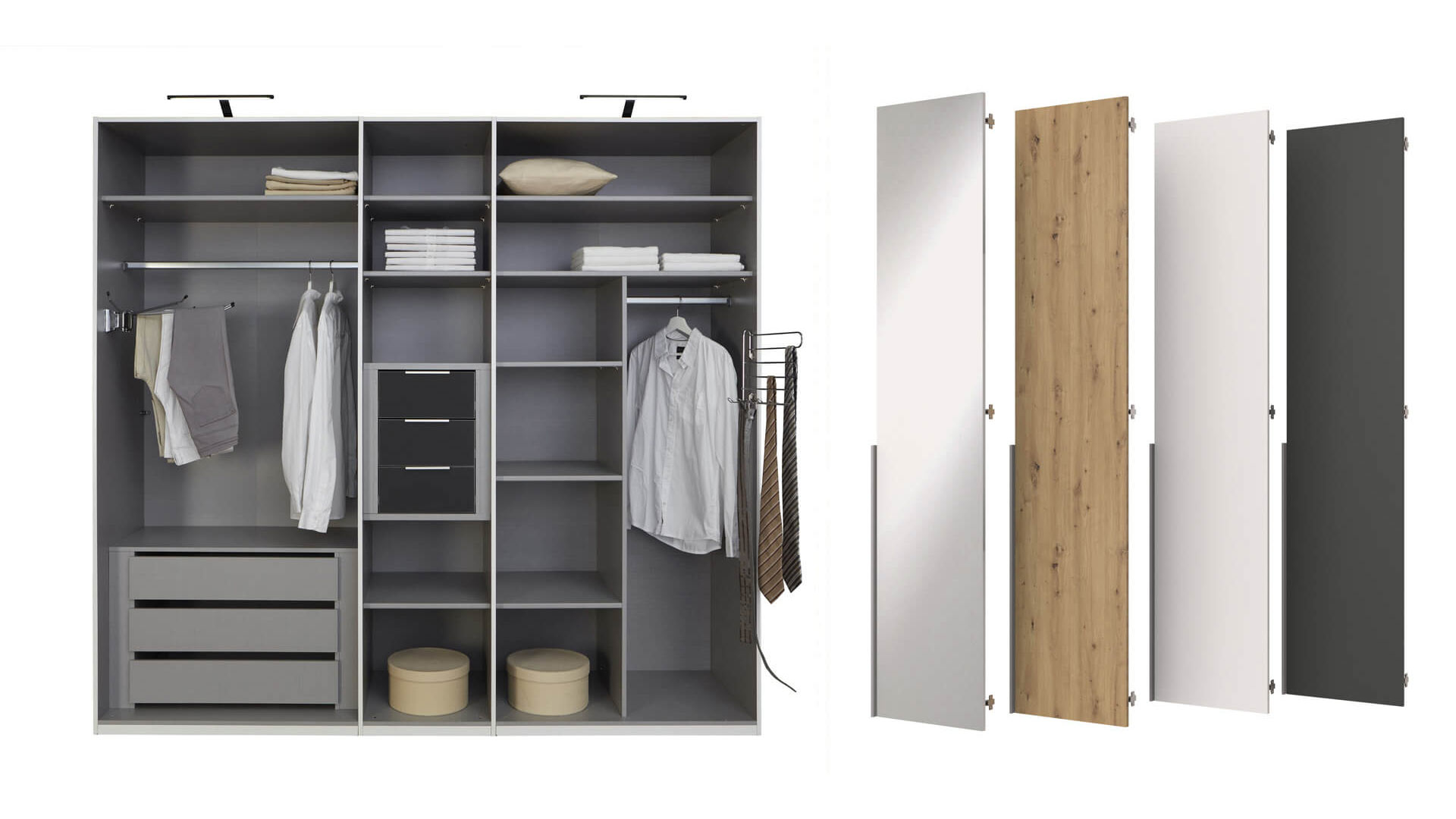 Auch das passende Zubehör für deinen favorisierten Kleiderschrank der Serie EASY PLUS stellst du dir im Hinblick auf die Funktion, den Komfort sowie der Außen- und Innenbeleuchtung von Korpus und Türen auf individuelle Weise nach deinen persönlichen Wunschvorstellungen zusammen: Verschieden bemessene Anbauelemente wie bodentiefe Spiegelfronten, clevere Eckschranklösungen und variable Regale eröffnen dir in der Kombination mit zusätzlichen Schubkästen, Wäscheeinteilungen, Einlegeböden und Kleiderhaltern beinahe unbegrenzte Gestaltungsmöglichkeiten für deinen EASY PLUS Kleiderschrank, der jeden Raum in ein begehbares Ankleidezimmer zum Verlieben verwandelt.