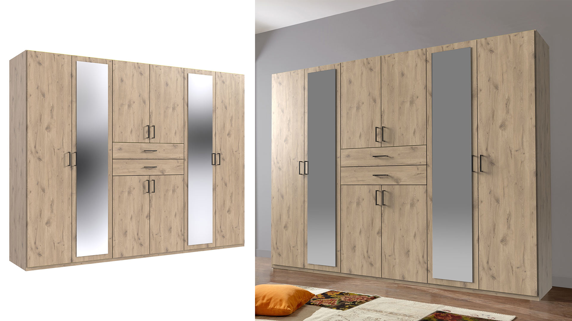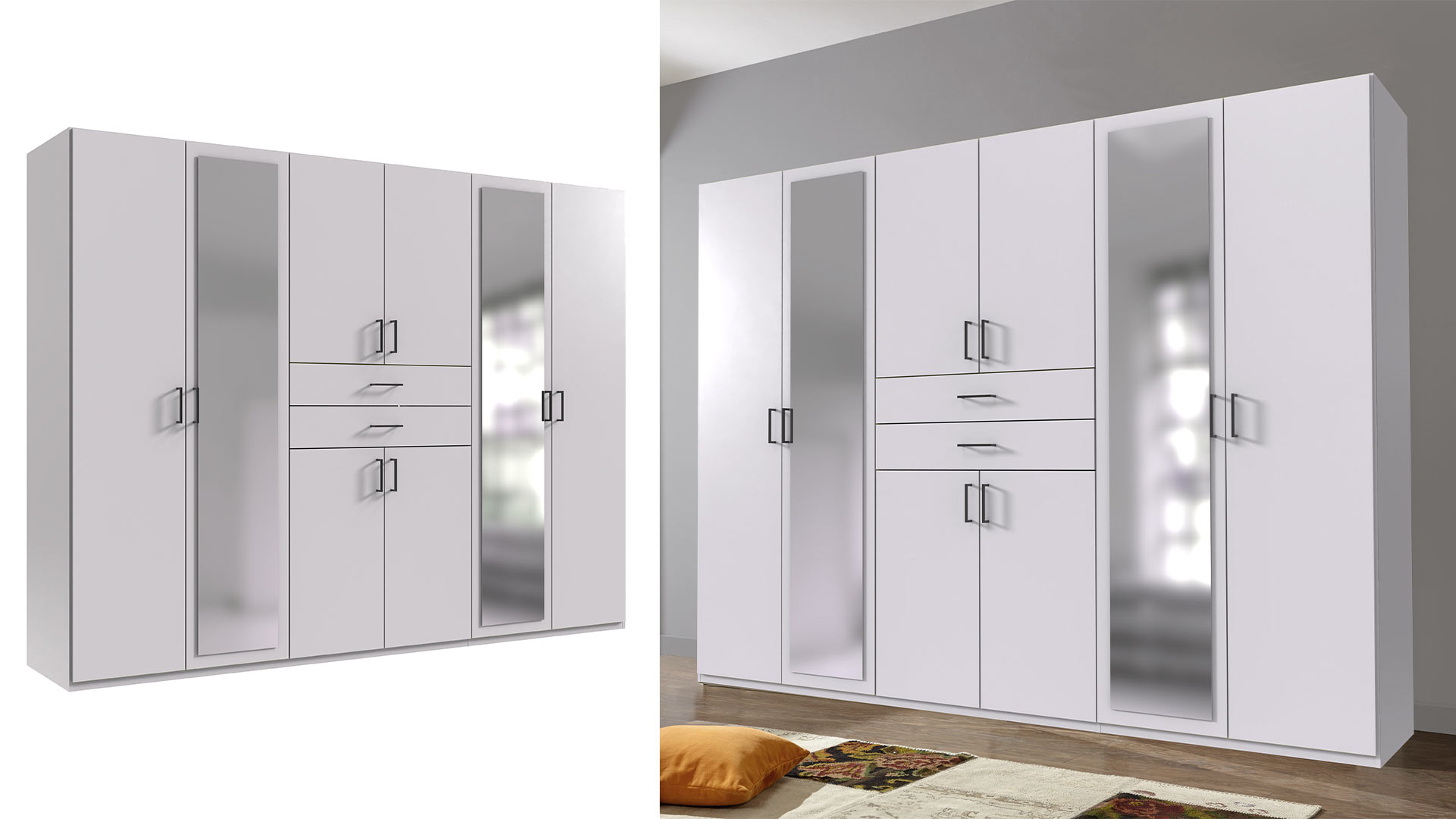 Links und rechts rahmen Spiegeltüren die Schubkästen ein. Sie geben Orientierung, holen den Fokus zurück auf dich, immer bereit für den letzten prüfenden Blick. Kurz checken, weitergehen. Der Schrank stärkt dir den Rücken, die Kontrolle bleibt bei dir.