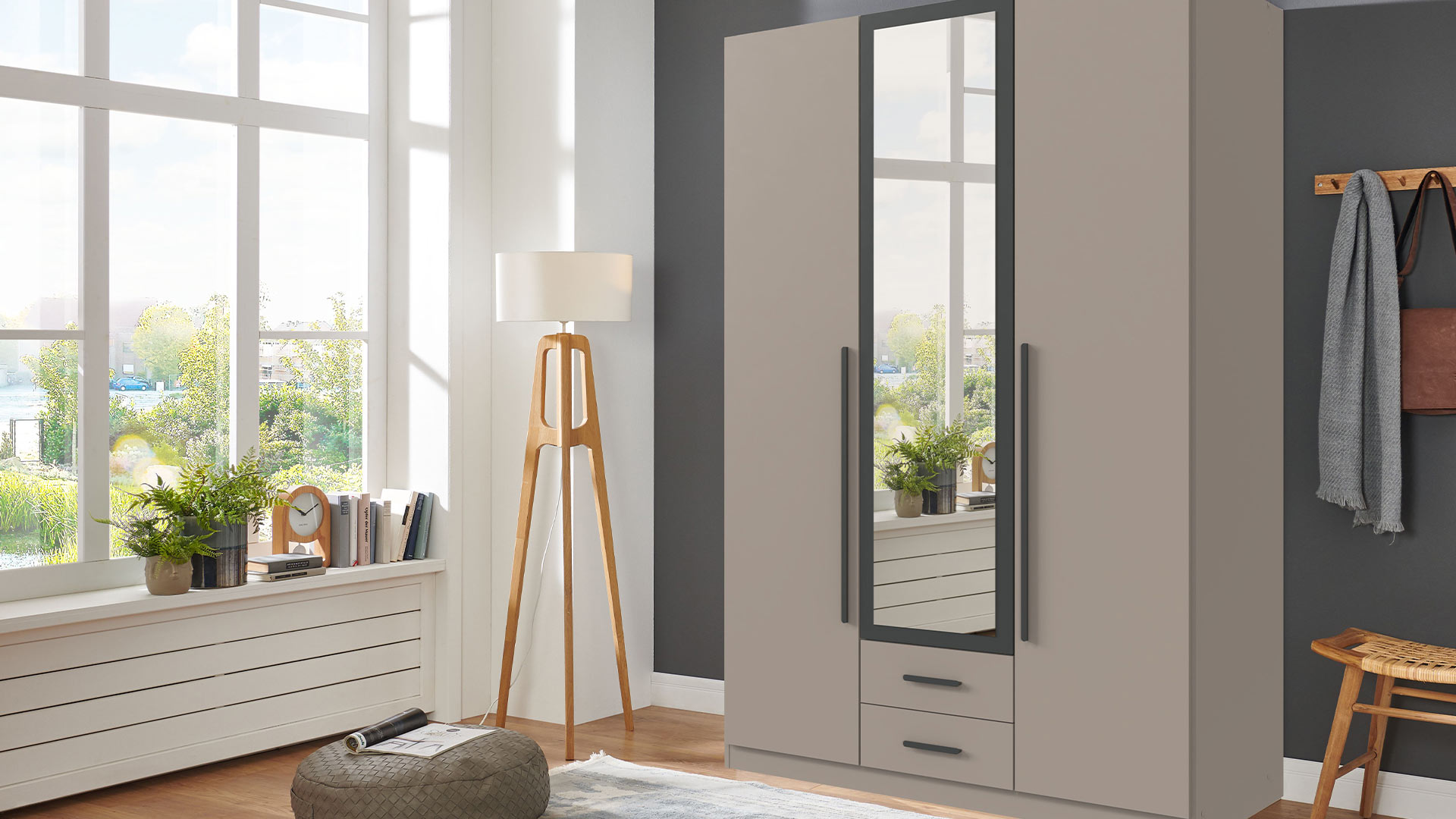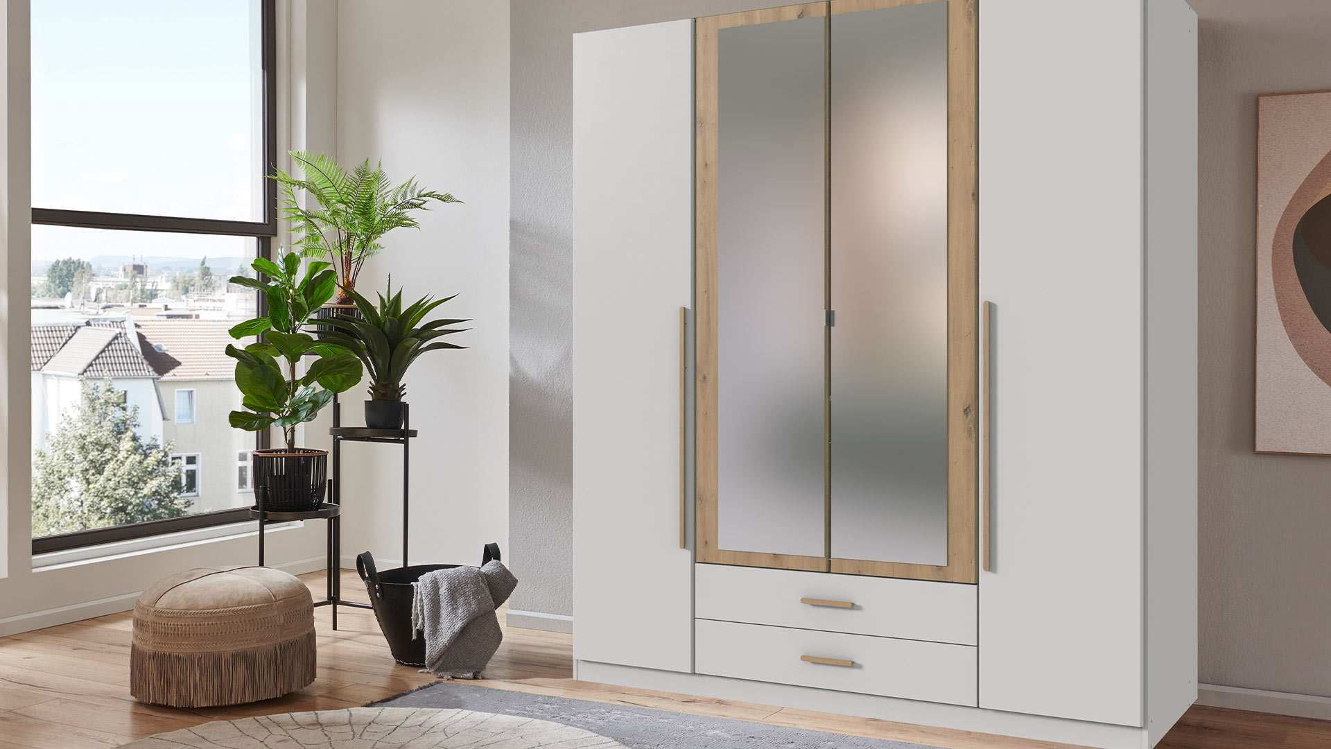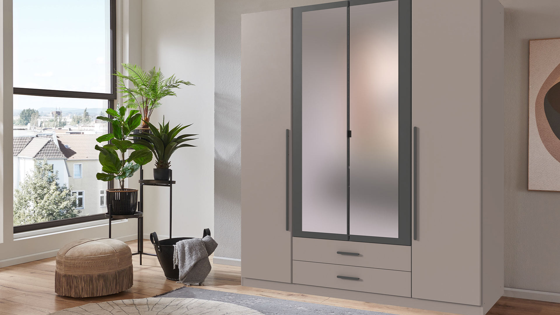 Optisch zeigt sich MARBURG modern und selbstbewusst. Weiß oder Saharagrau bilden eine ruhige, klare Basis. Mitteltüren und Griffe in Grafit setzen kontrastreiche Akzente und geben dem Schrank Haltung. Die Variante in Artisan-Eiche-Nachbildung bringt Wärme ins Spiel, weich und natürlich, ohne an Klarheit zu verlieren. Der Spiegel ist dabei kein Detail, sondern Bühne. Die Absetzung rahmt dein Spiegelbild, lenkt den Blick und schafft Fokus. Auf dich.